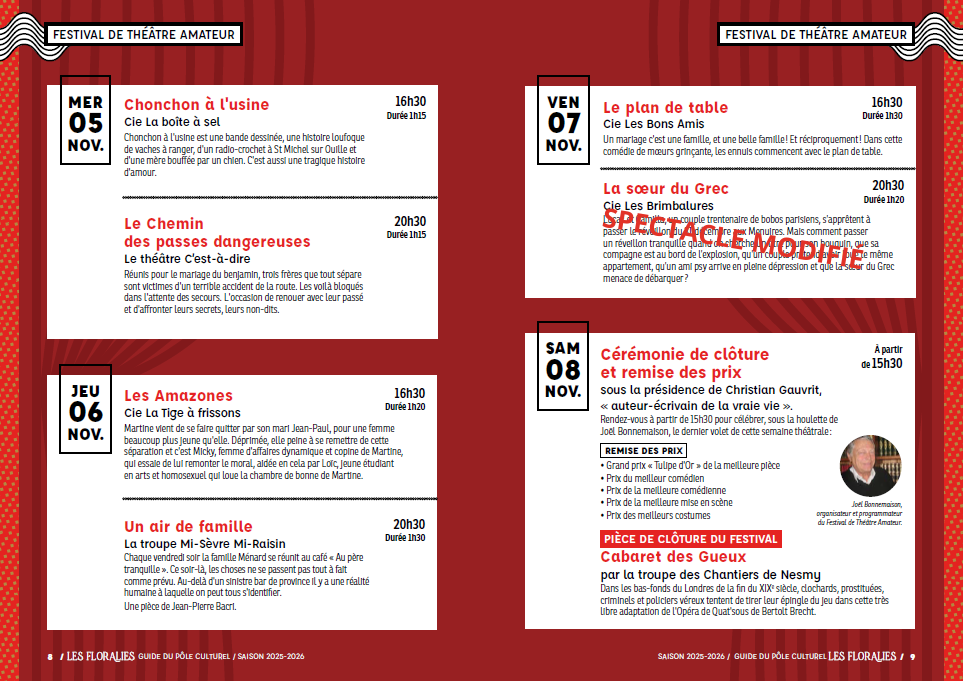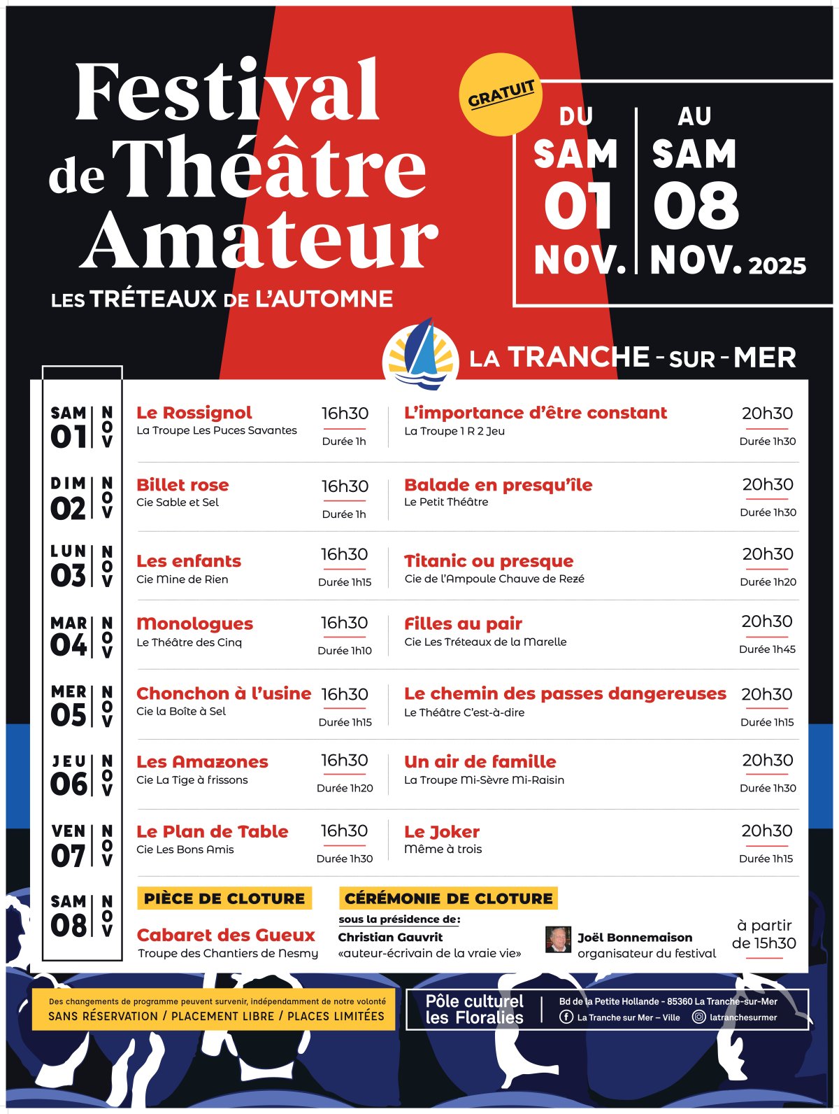 Pas moins de 14 troupes amateures vont se mesurer lors de cet événement incontournable de la saison cutlurelle. Tous les styles théâtraux - ou presque - seront représentés et Joël Bonnemaison cette année encore aura déniché pour notre plus grand plaisir les pépites du genre.