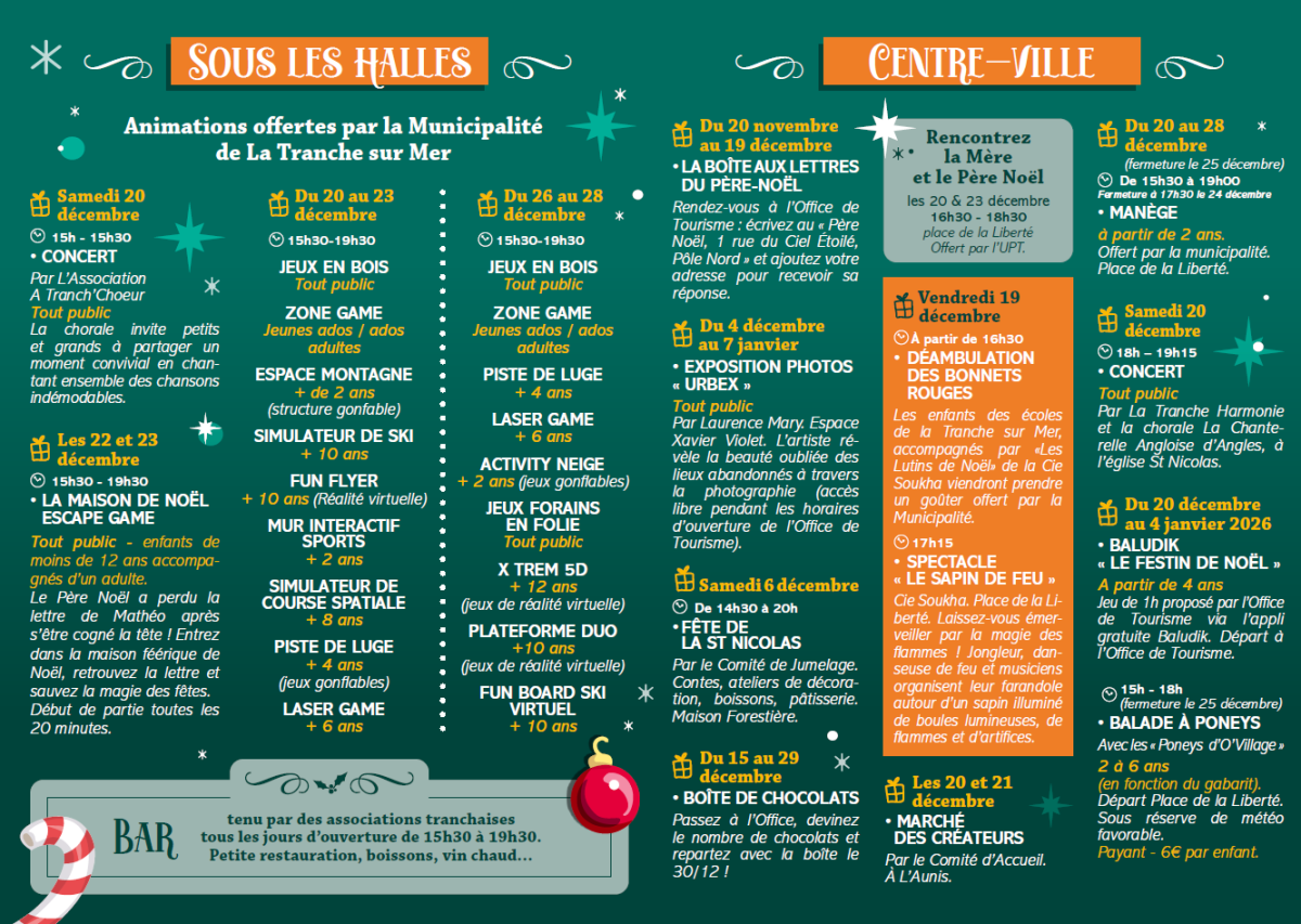 Du 20 au 23 décembre et du 26 au 28 décembre, retrouvez sous les Halles différentes animations offertes par la municipalité.